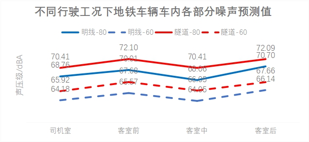 4. 仿真预测与验证:为确保本论文相关研究结果具有可靠性,在进行仿真预测之前,需要对建模方法准确性以及隧道混响会提高地铁车辆车内噪声声压级进行验证。本论文的声学模型建模方法与论文《隧道内地铁列车车内噪声特性及其关键影响因素研究》中的声学建模方法相同,该文献与线路试验结果进行对比验证了仿真预测模型的准确性,将本论文的仿真预测结果与该文献结论对比,基本吻合,故证建模方法具有一定准确性。本论文相关仿真预测结果如图9、图10所示。